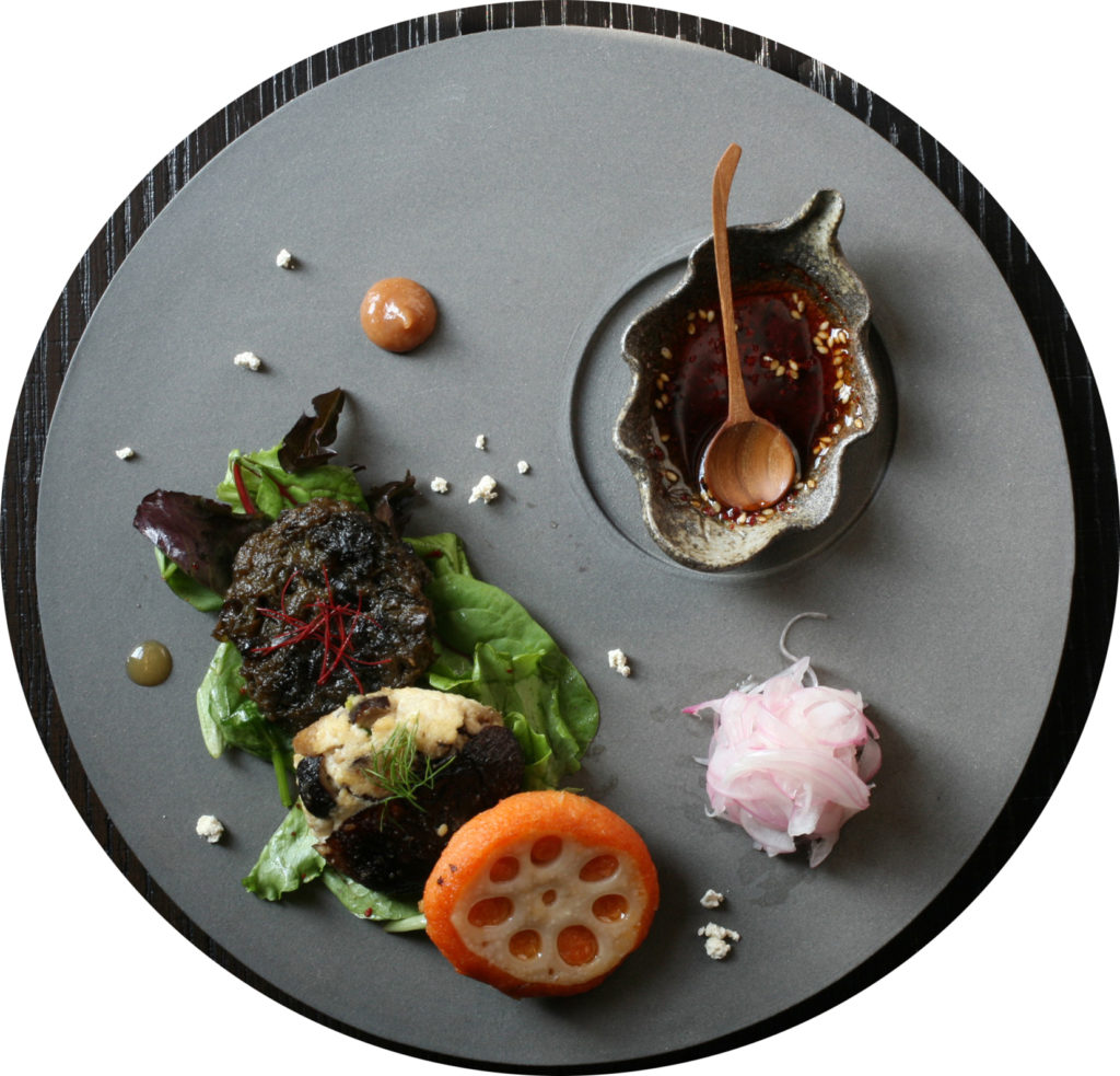 Hayao Watanabe ha voluto scherzare con il mondo marino rievocandolo in una cialda a forma di orata ripiena che combina ingredienti nipponici come il daikon e il sake con la nocciola piemontese. Nel secondo piatto, il tradizionale Aki giapponese, i legumi e in particolare i fagioli sono stati trattati con diversi metodi di cottura: bolliti, schiacciati, emulsionati e fermentati.