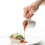 «Qui ci si sposta sulle sponde meridionali del lago di Garda, verso la pianura bresciana. I funghi rappresentano la base del piatto – in questo periodo utilizziamo i pleurotus, di provenienza locale – insieme alle radici di pastinaca che contribuiscono a dare dolcezza e sapidità. Sopra questa insalata vegetale viene posizionato lo storione, cotto sottovuoto a 60°C per 36 ore e poi glassato con una besciamella alla genziana e polvere di cappero. Direttamente in tavola, viene aggiunta nel piatto una salsa particolarmente densa a base di fondo di prezzemolo e cipolla cotto in acqua e poi filtrato».