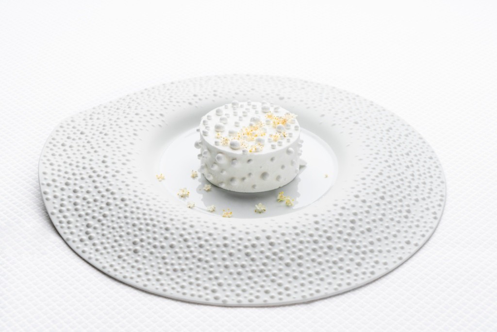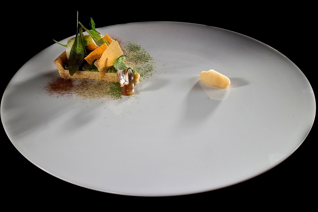 «Ci sono tutti gli elementi del classico tiramisù, che viene richiamato anche alla vista, ma gli ingredienti ovviamente cambiano e il piatto ha una matrice salata. Noi lo proponiamo come antipasto». Il biscotto savoiardo, realizzato con tuorlo d’uovo, zucchero semolato e fecola di patate, viene imbevuto in un brodo di porcini. A comporre i diversi strati ci sono anche il budino di porcini, il ragù di porcini, l’olio ai porcini e la crema al mascarpone, preparata con tuorlo e panna infusionata per una notte con porcini secchi. Sopra, una polvere di porcini secchi e cacao amaro. «Come si può facilmente capire, questa preparazione, così come le precedenti, è piuttosto lunga e laboriosa: serve tempo, una grande tecnica, ma soprattutto molta, moltissima dedizione per il proprio mestiere».
