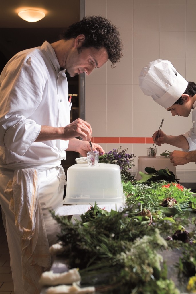 Per i grandi chef è d’obbligo rendere gourmet ogni preparazione, ma come si fa per gli elementi vegetali? «Rispettandoli, trattandoli bene. La verità è che solo se li senti come “tuoi”, riesci a dare loro la giusta importanza». Paragonati alla carne o al pesce, sono ingredienti più fragili, vanno letteralmente curati, oltre che studiati con attenzione. «Alcune verdure, ad esempio, possono essere cucinate solo espresse, altrimenti perdono la loro brillantezza e croccantezza. Poi ovvio, ci vuole anche il fattore fantasia. Con i fiori e le foglie del tagete, ad esempio, noi ci prepariamo un gelato».